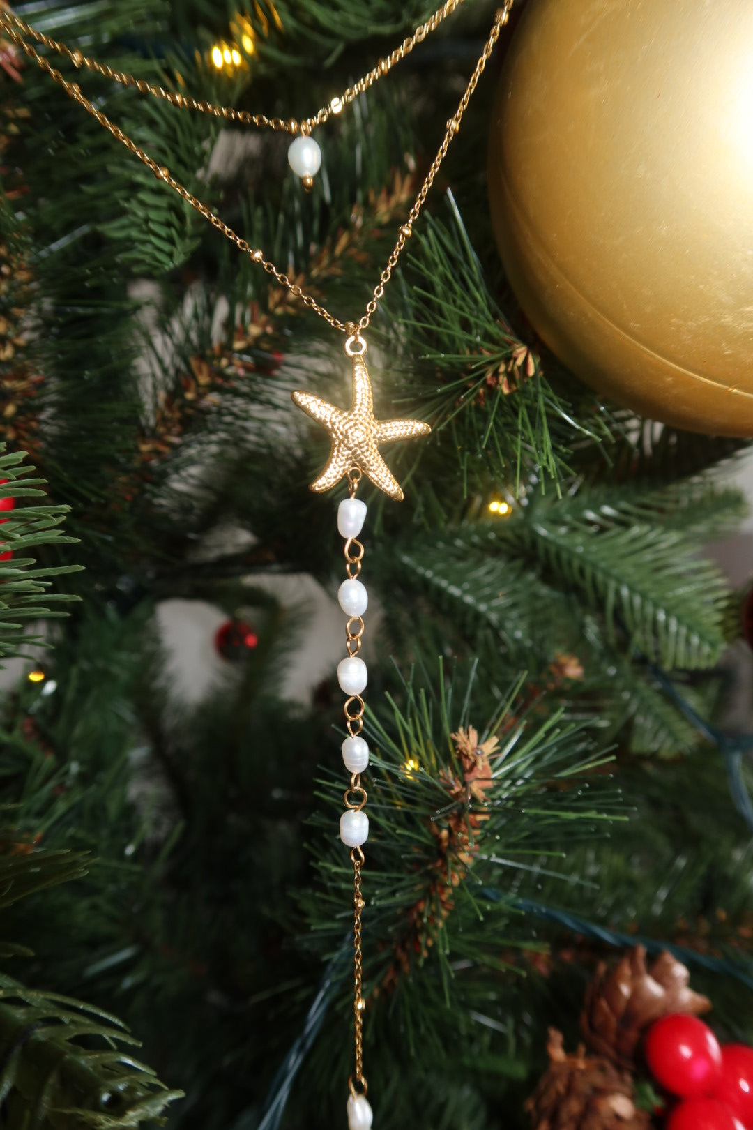 Three fine golden chains layered with delicate bead details and a central starfish pendant adorned with cascading pearls for soft ocean-inspired elegance. Designed to create effortless depth and movement, this piece layers the shimmer of gold with the softness of pearls, capturing the glow of sunlit seas. Perfect for statement styling or elevating a simple neckline.