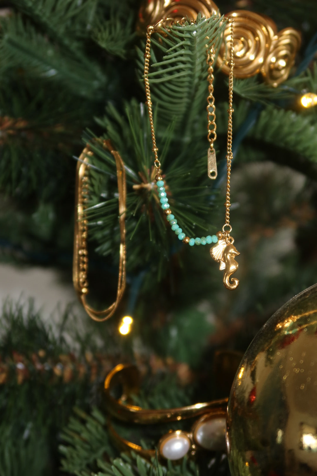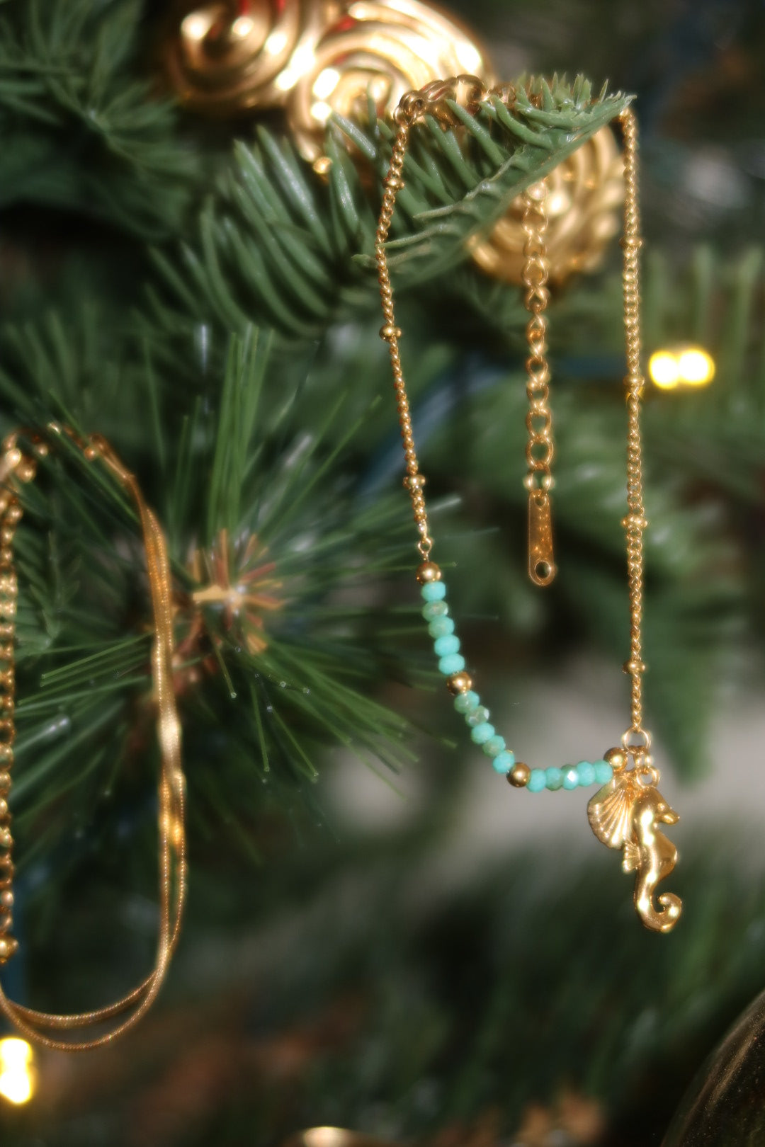 Accented with soft sea-green beads and two golden charms, a polished scallop shell and a sculpted seahorse. This bracelet is light, playful and full of ocean energy, it brings a subtle pop of colour and a warm golden glow to the wrist.