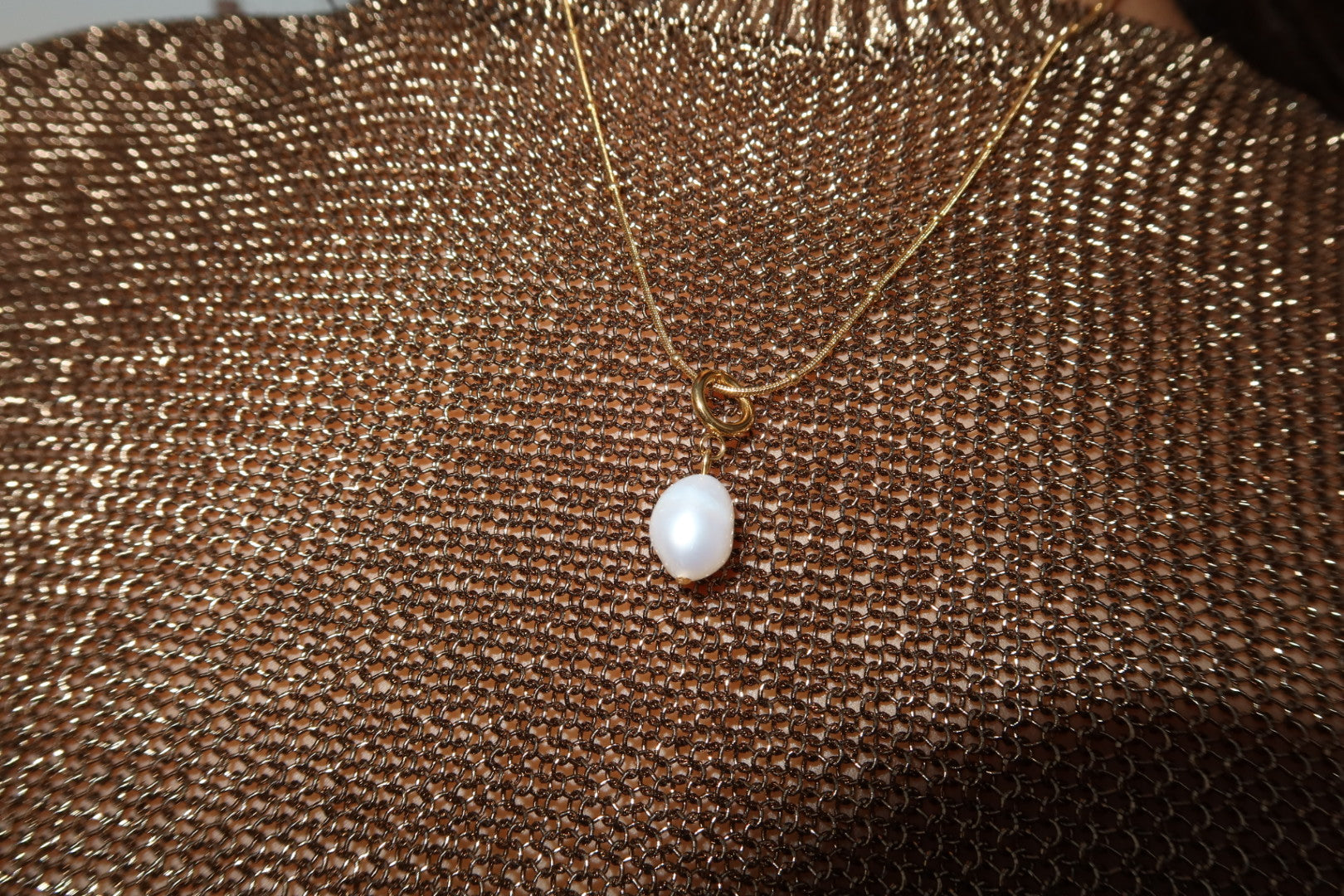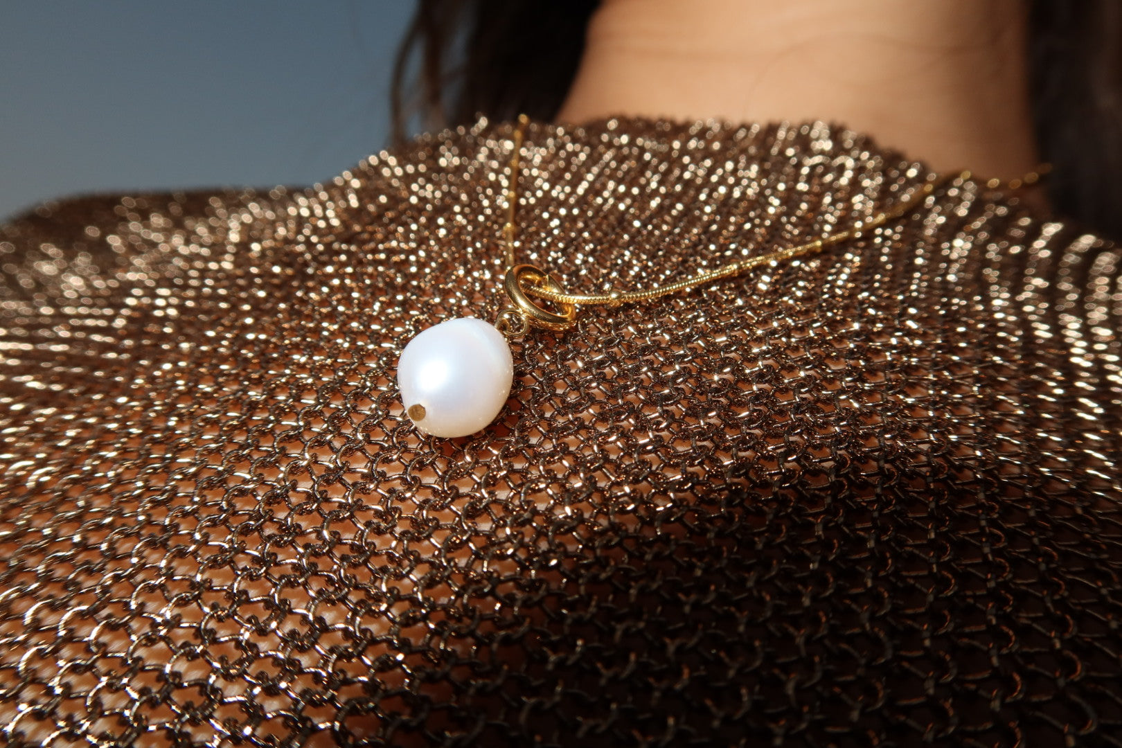 A timeless pearl pendant suspended from a delicate golden chain. Effortless, luminous and endlessly versatile, this is a modern wardrobe essential designed to complement any look.
