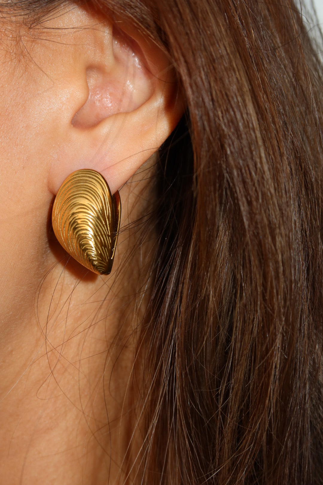 Golden mussel shells with flowing engraved ridges. Their curved silhouette creates a smooth, elegant finish reminiscent of natural seaside treasures. A minimalist yet striking coastal statement.