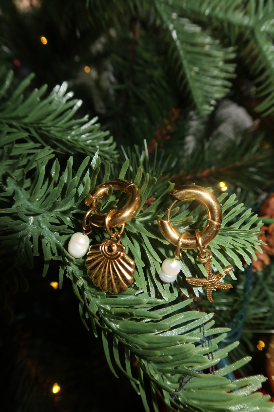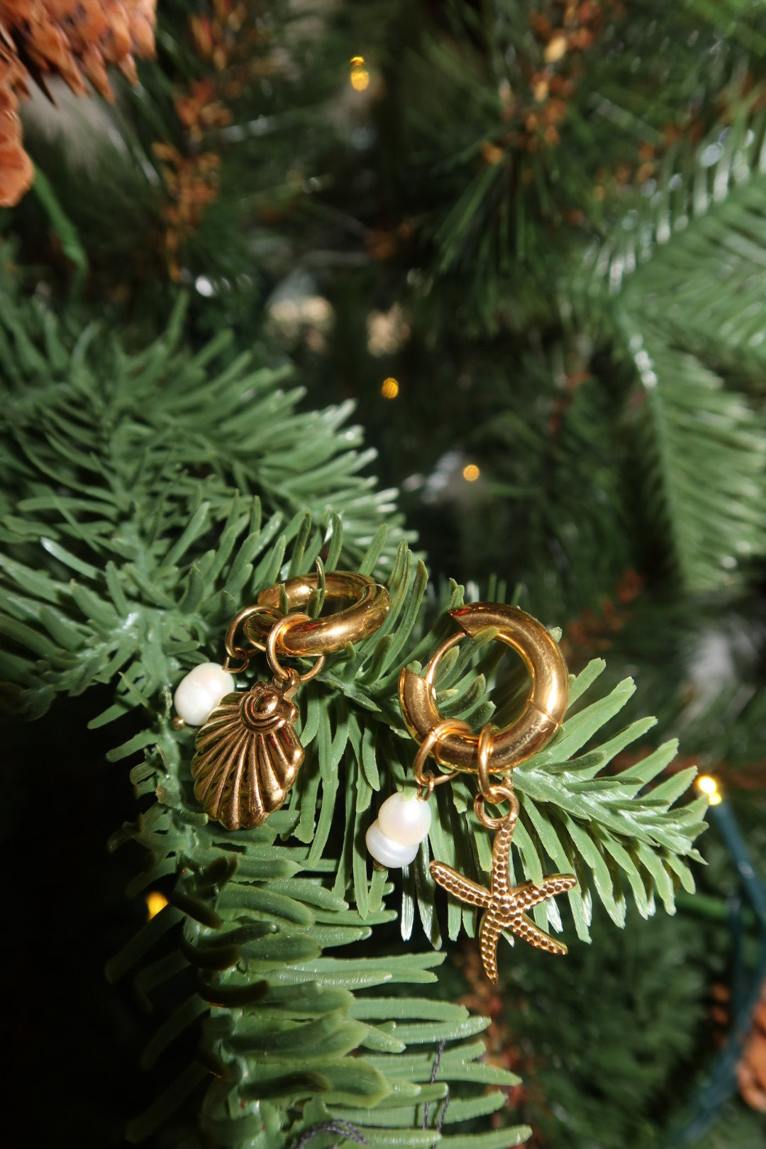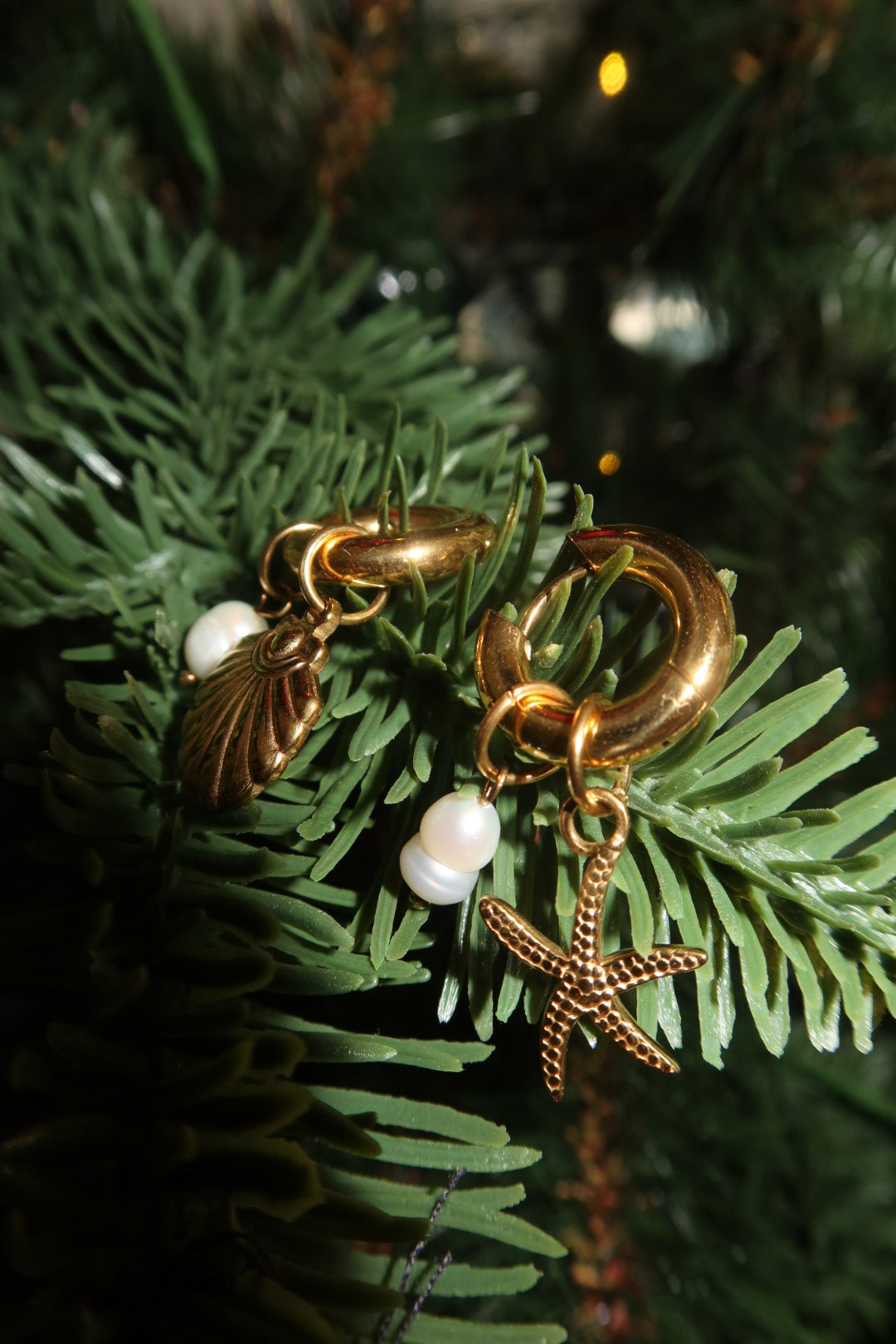 These earrings feature a beautiful assortment of ocean charms. A textured starfish, a scallop shell and three lustrous pearls. Lightweight and full of movement and fun these earrings add a warm, beach-inspired glow to any look.