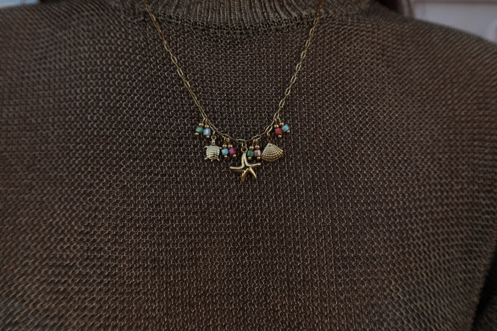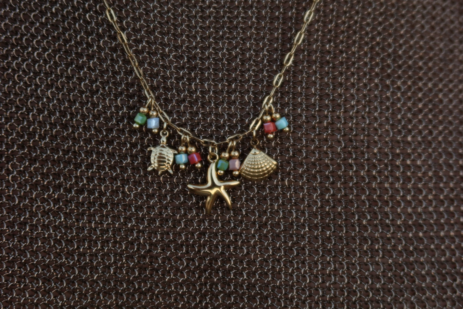 This necklace has a playful arrangement of ocean-inspired charms: a starfish, seashell, turtle and soft pastel beads. The mix of textures and colours creates a warm, sun-kissed feel that evokes holidays, shorelines and golden evenings by the sea. Light, joyful and effortlessly wearable.