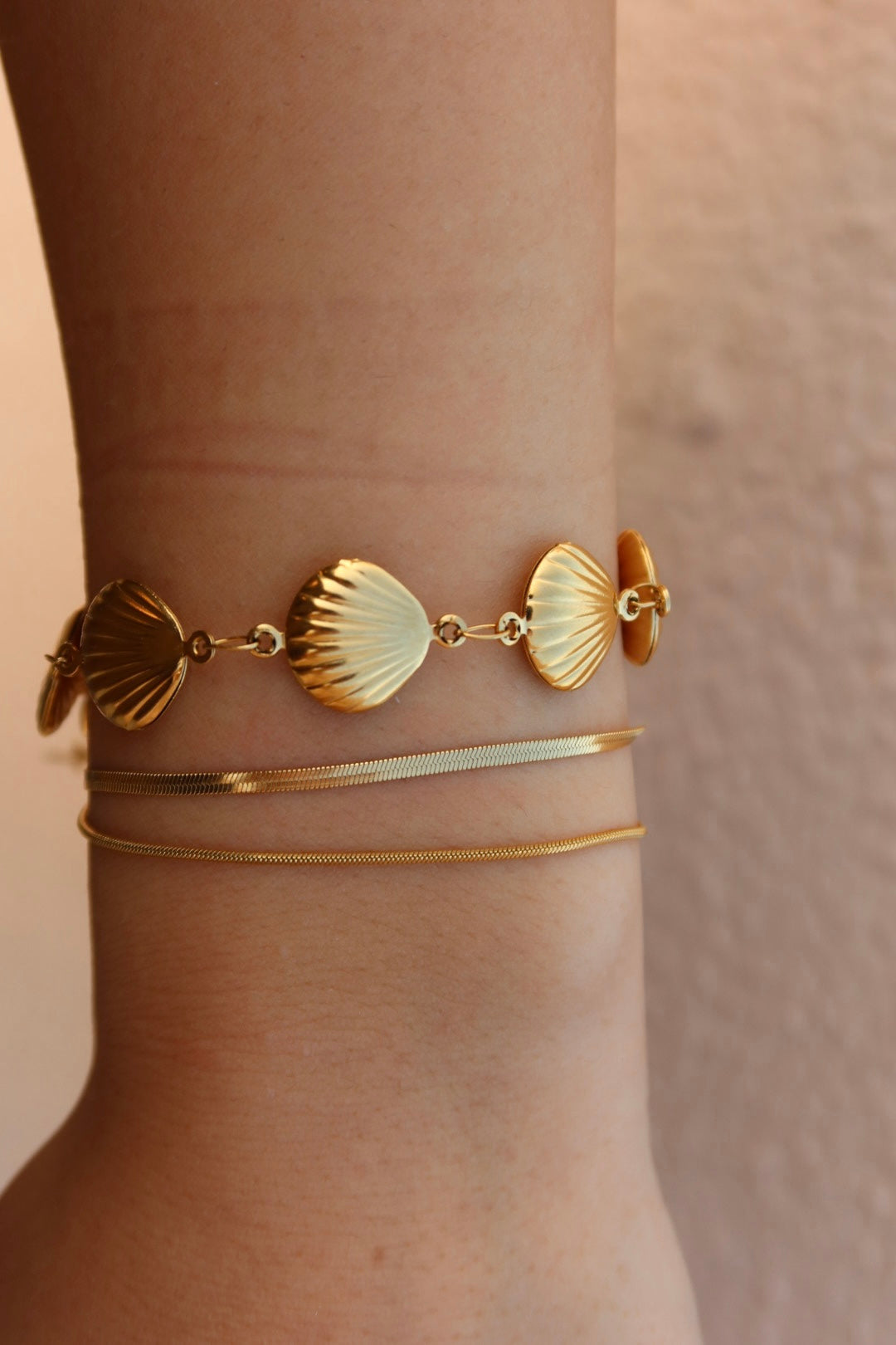 A delicate bracelet featuring golden clam shells linked together in a fluid chain. The textured ridges reflect soft light with every movement, creating a warm, sunlit glow on the wrist.