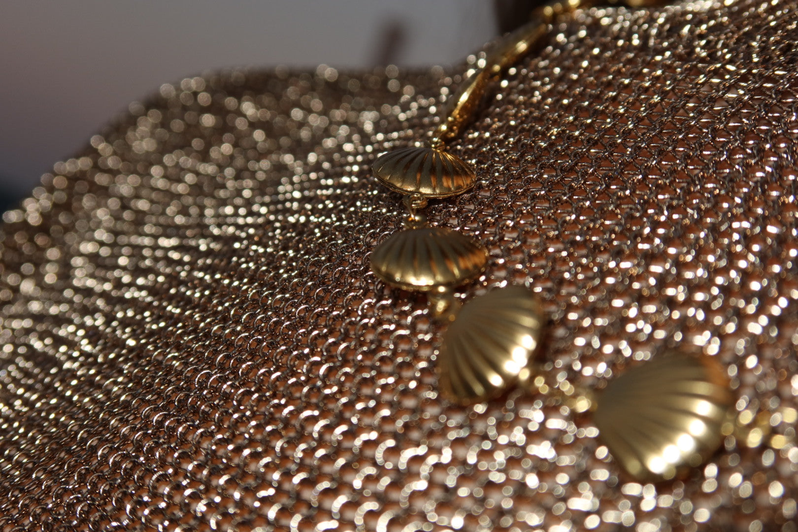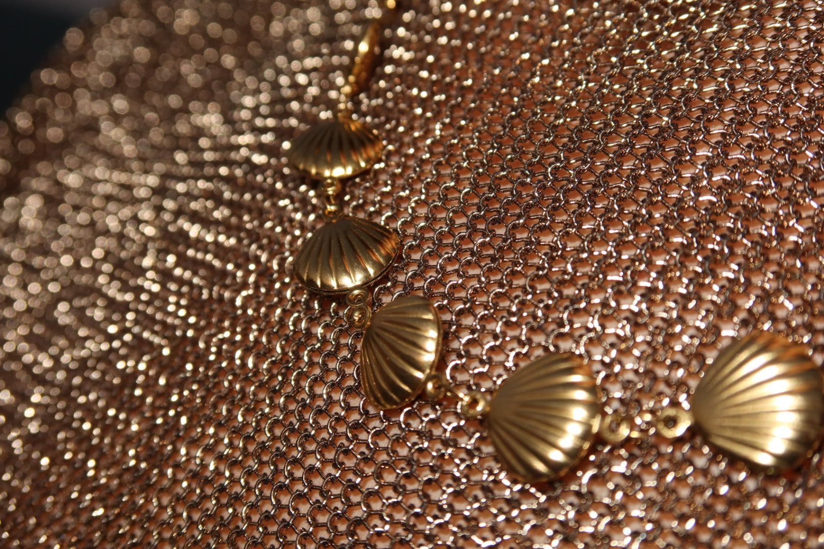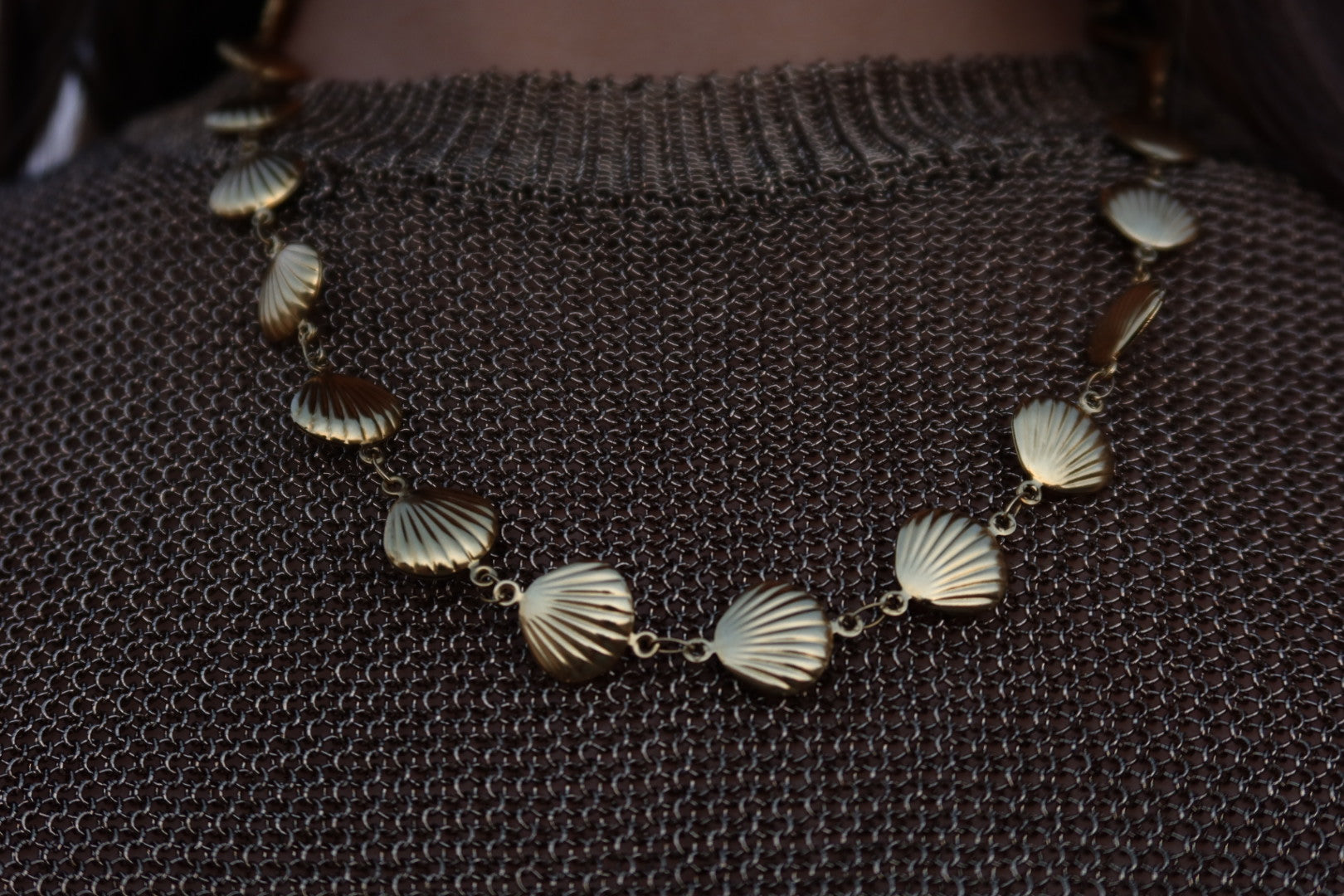 A radiant necklace composed of golden clam shells forming a continuous, fluid chain. Each shell is detailed with gentle ridges that catch the light, creating a warm coastal glow around the neckline. A beautiful statement piece that balances elegance with ocean-inspired charm.